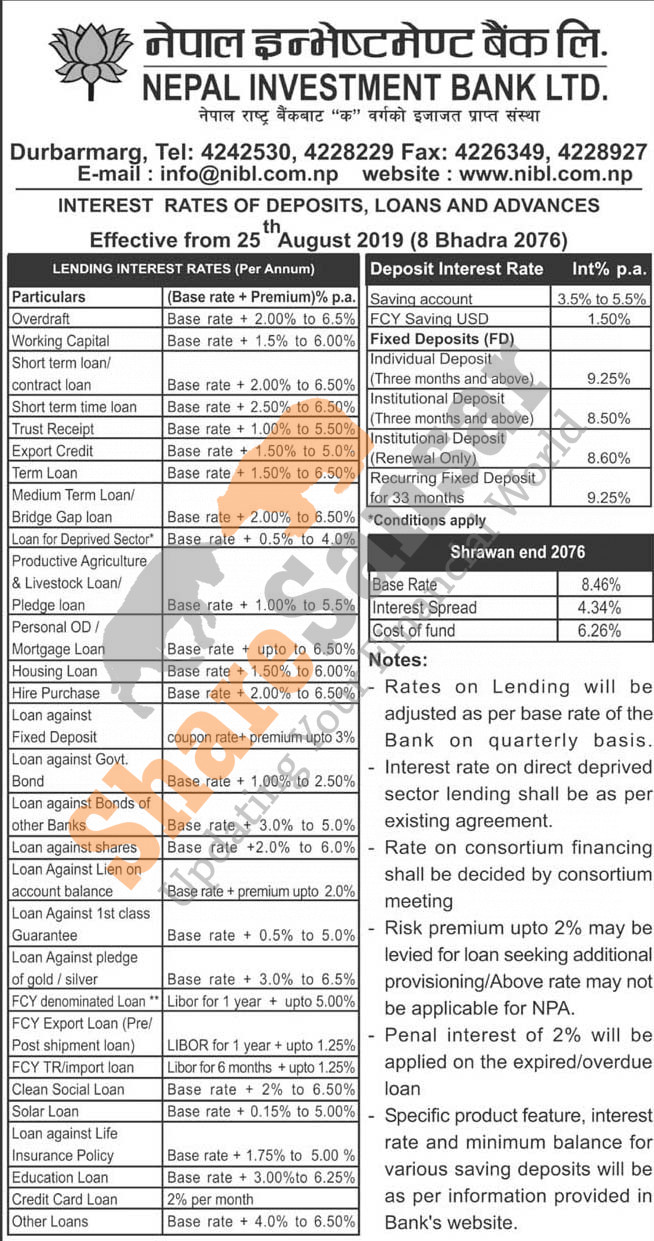 Nepal Investment Bank Limited has published a notice regarding new interest rate and its effective from 8th Bhadra, 2076.