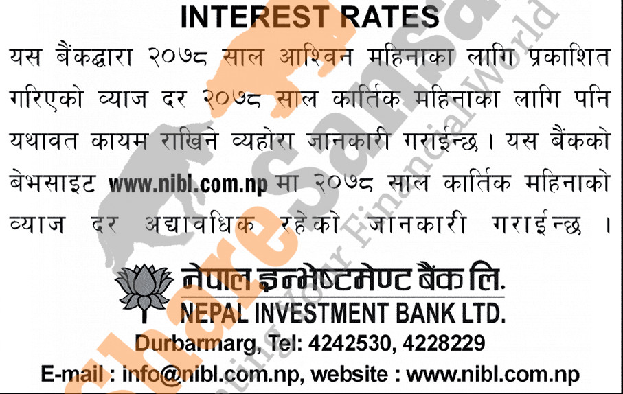 Nepal Investment Bank Limited has published a notice regarding new interest rate which will remain same as of previous month and it's effective from 1st Kartik, 2078.