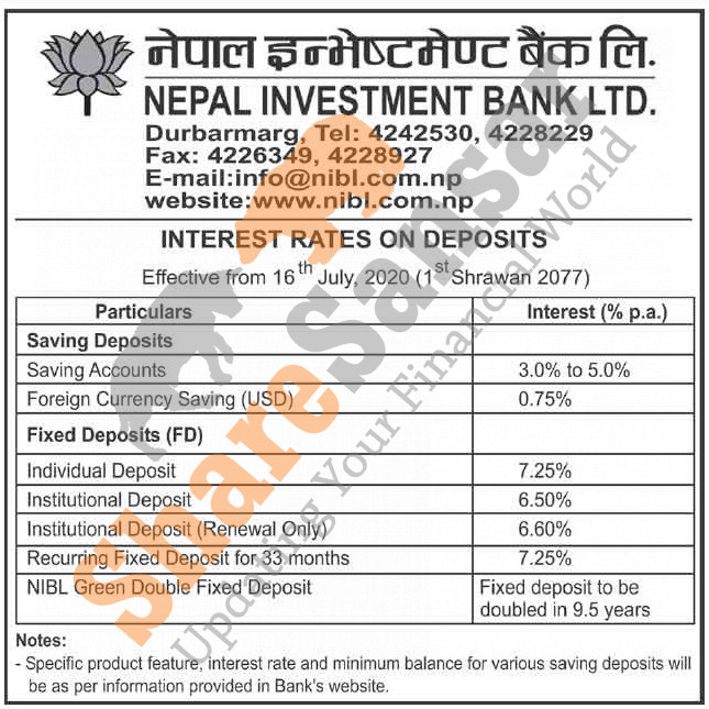 Nepal Investment Bank Limited has published a notice regarding the interest rate of various deposit products.