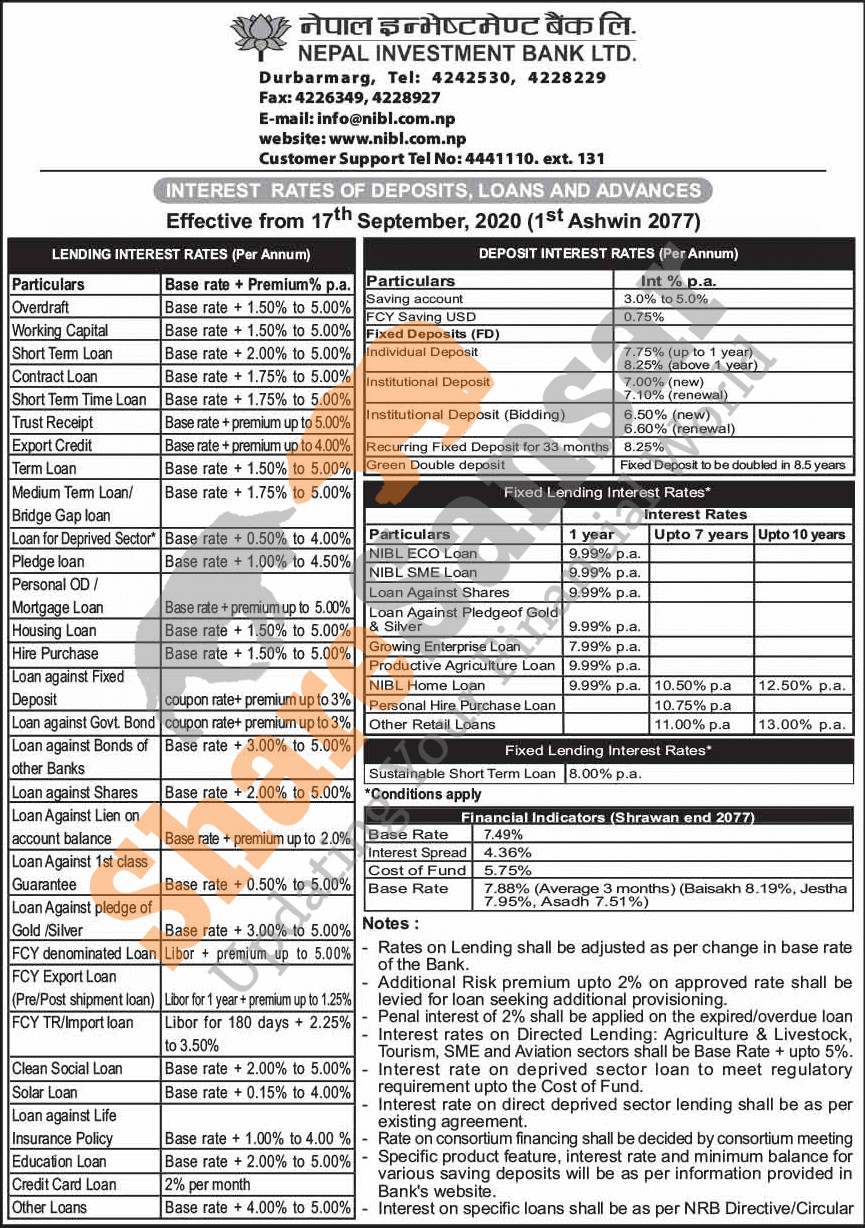 Nepal Investment Bank Limited has published a notice regarding the new interest rate for its deposit and loan product and its effective from 1st Ashwin, 2077.