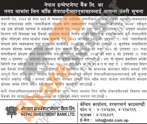 Nepal Investment Bank Limited has published a notice to collect uncollected due dividend to its shareholders.