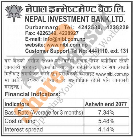 Nepal Investment Bank Limited published its base rate of Ashwin End, 2077.