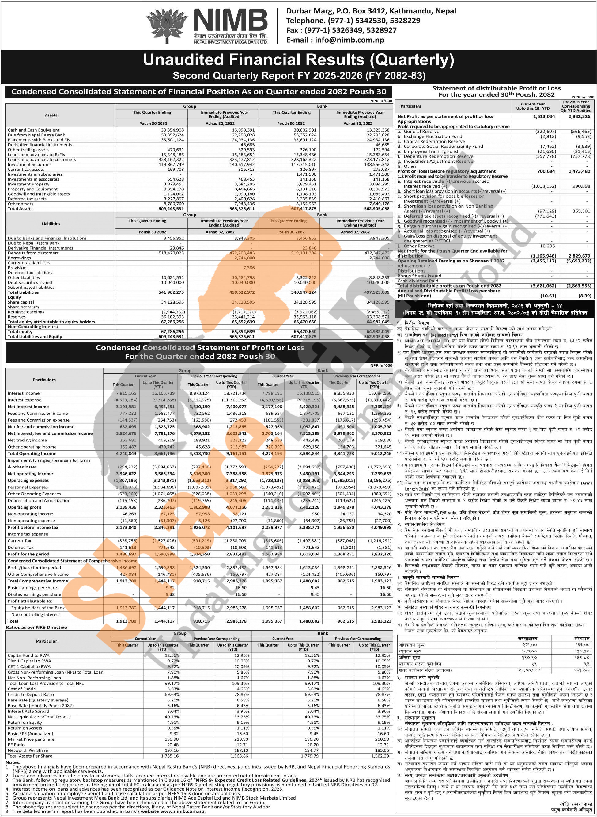 Nepal Investment Mega Bank Limited has posted a net profit of Rs 1.61 billion and published its 2nd quarter company analysis of the fiscal year 2082/83.