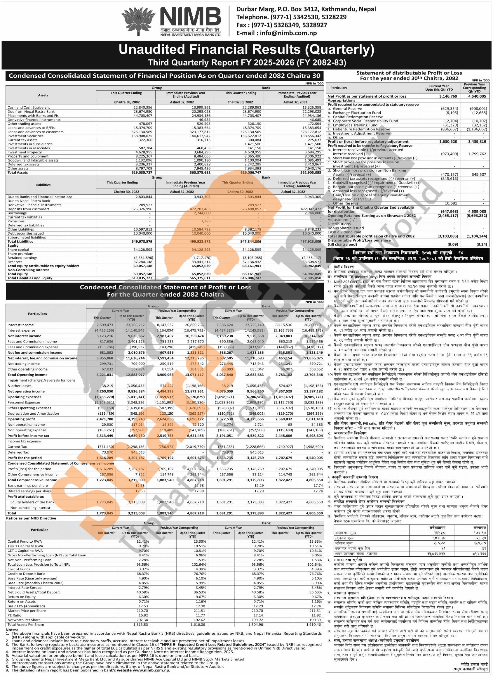 Nepal Investment Mega Bank Limited has posted a net profit of Rs 3.14 billion and published its 3rd quarter company analysis of the fiscal year 2082/83.