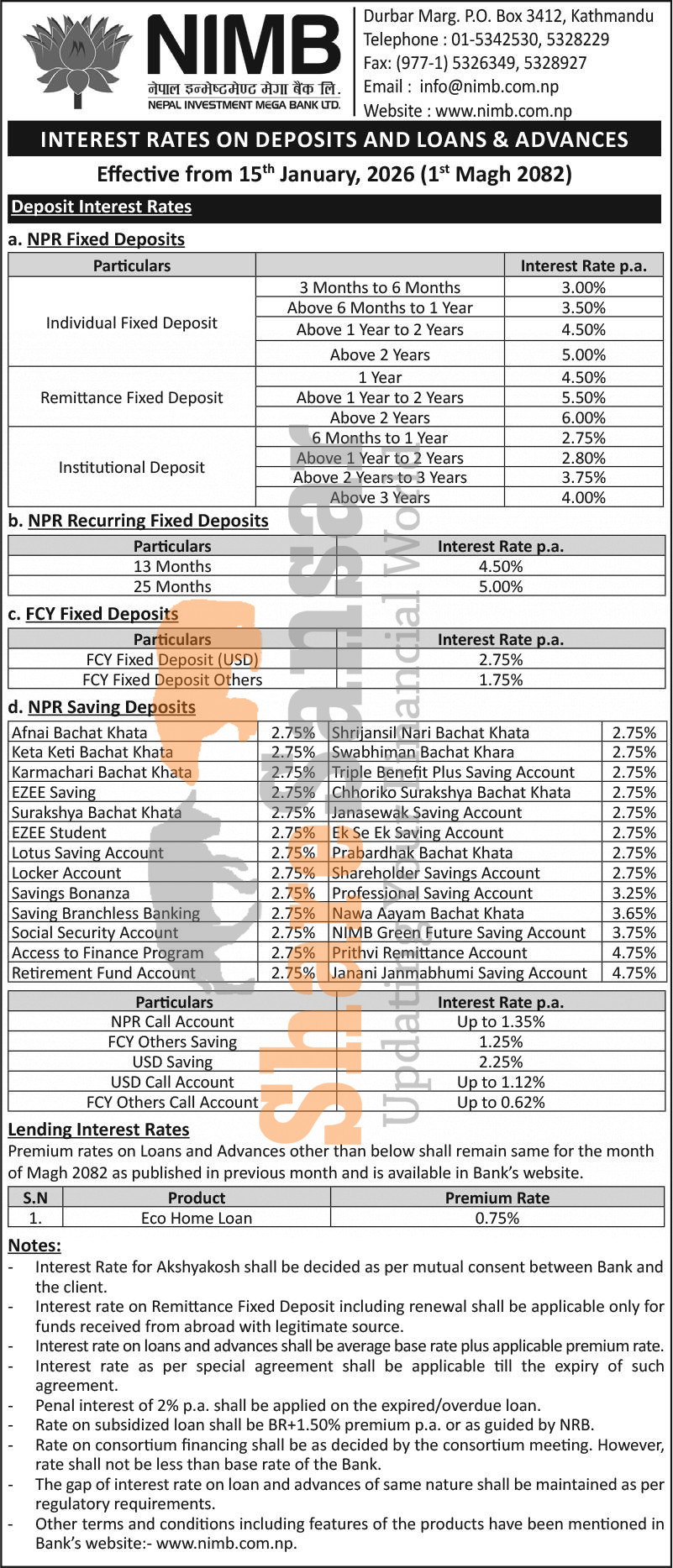 Nepal Investment Mega Bank Limited has published a notice regarding the new interest rate for deposit and loan products and it's effective from 1st Magh, 2082.