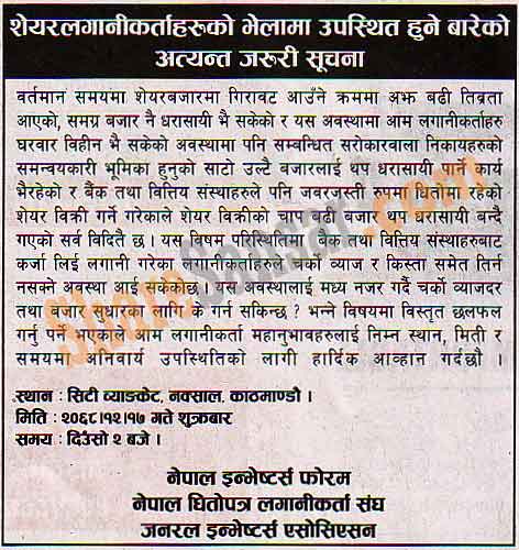 Nepal Investors Forum has published a notice regarding investors meeting going to be held on today (17th Chaitra 2068) at City Banquet, Naksal.