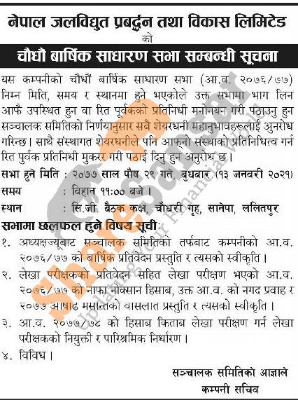 Nepal Jalbidhyut Prabardan Tatha Bikas Limited has announced its 14th AGM going to be held on 29th Poush, 2077.