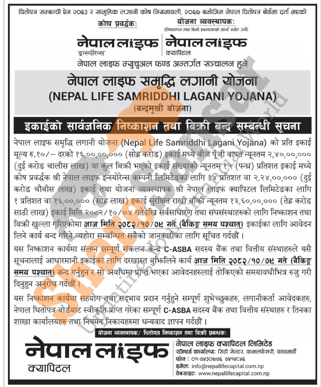 Nepal Life Capital Limited is closing its 160 million units of Rs 10 face value each mutual fund scheme "Nepal Life Samriddhi Lagani Yojana" to the general public from today (9th Magh, 2082).