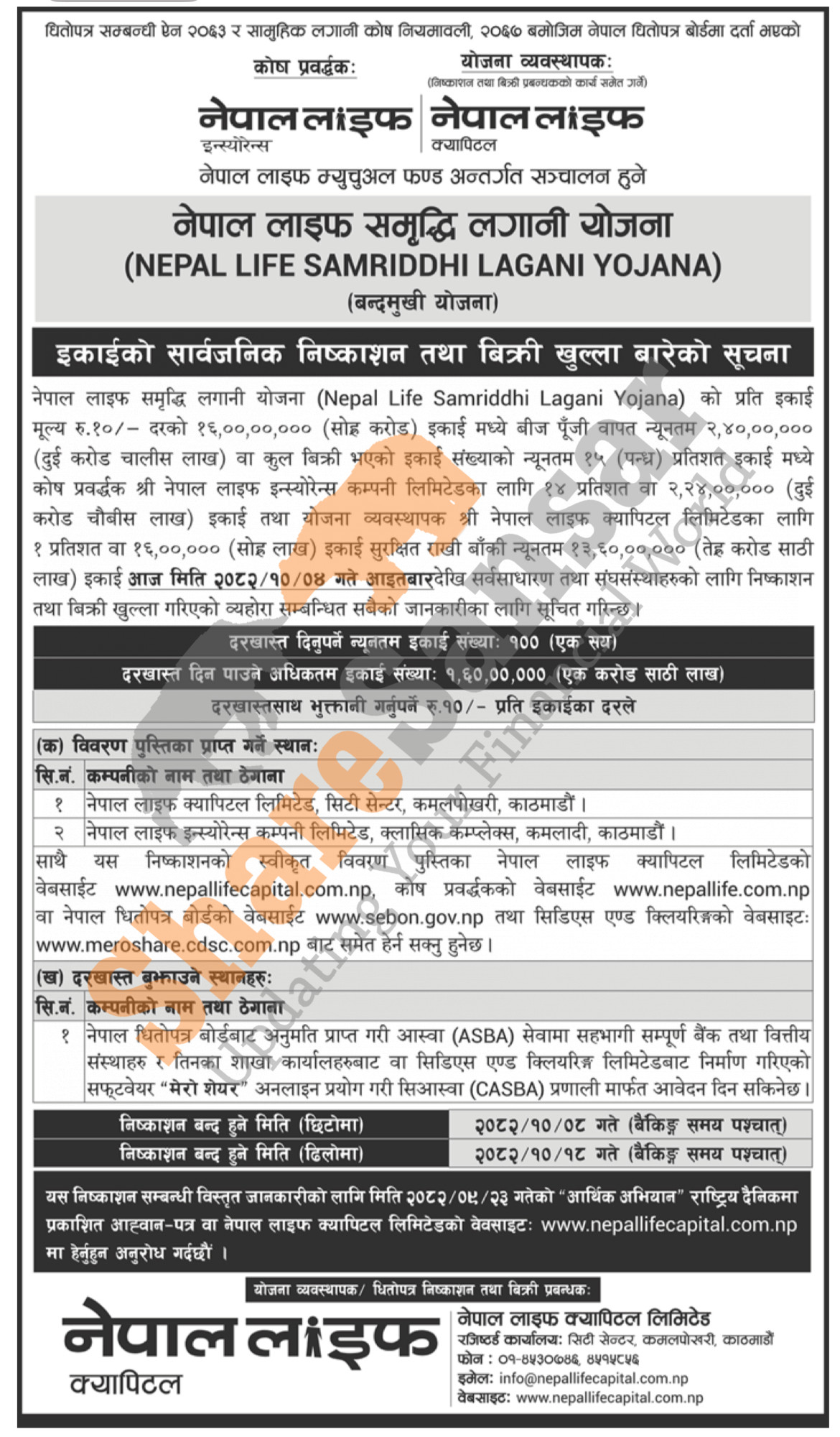 Nepal Life Capital Limited is opening its 160 million units of Rs 10 face value each mutual fund scheme "Nepal Life Samriddhi Lagani Yojana" to the general public from today (4th Magh, 2082).