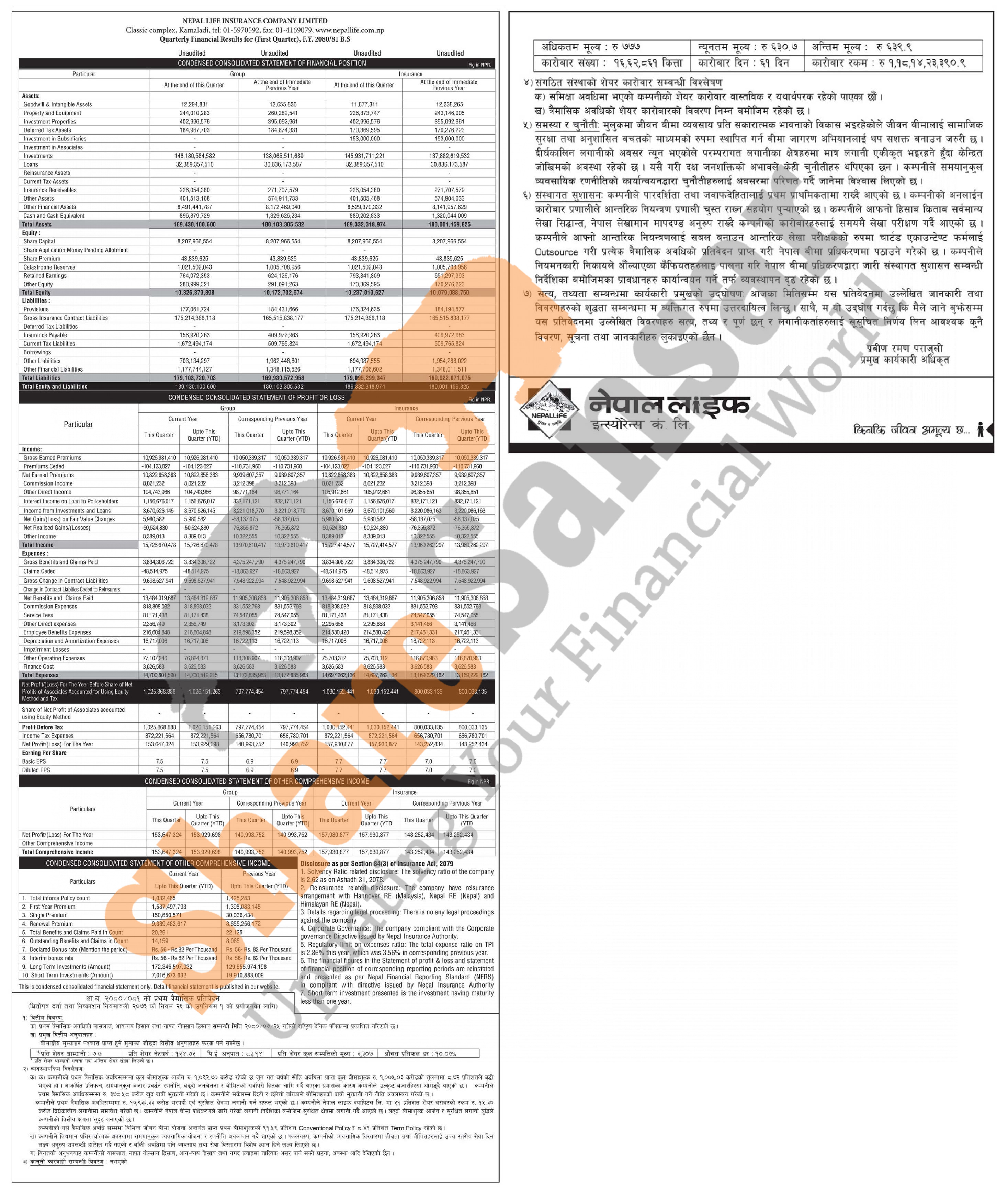 Nepal Life Insurance Company Limited has posted a net profit of Rs 153.92 million during the 1st quarter of the fiscal year 2080/81.