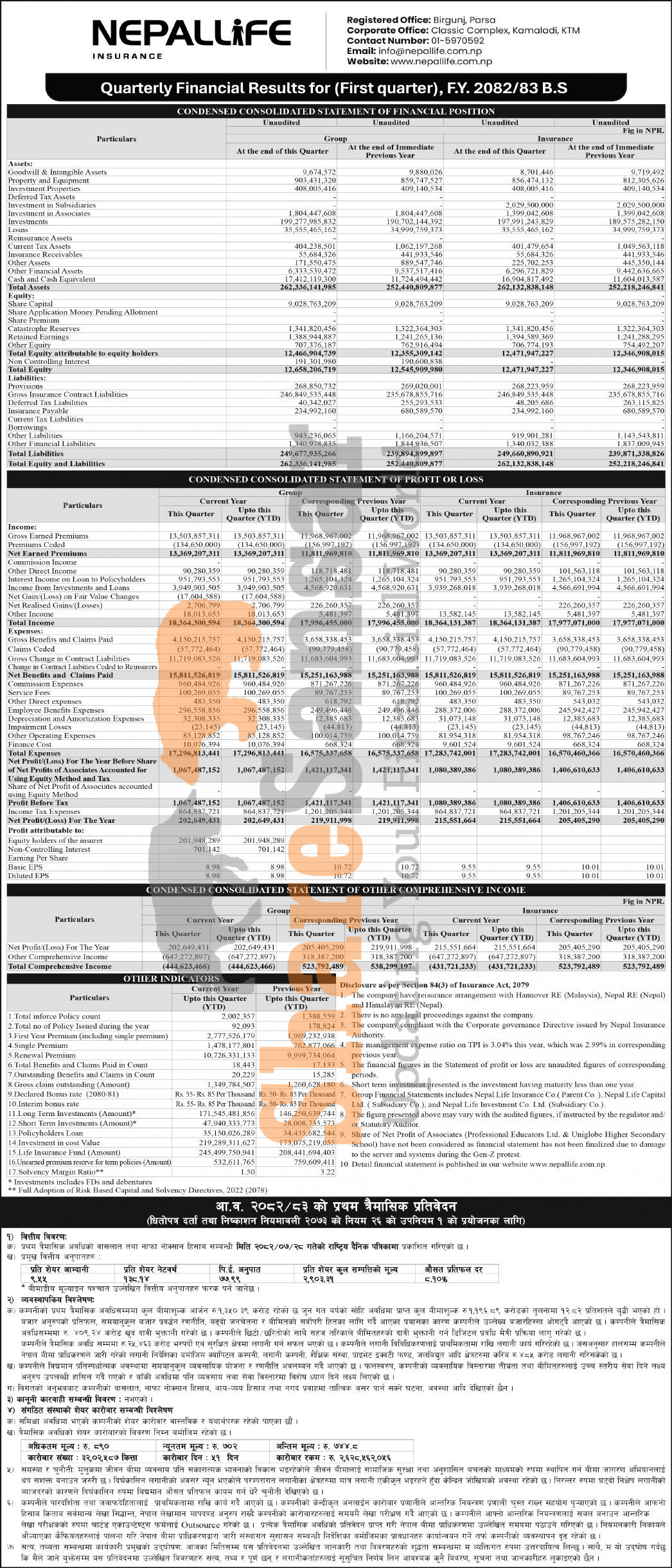 Nepal Life Insurance Company Limited has posted a net profit of Rs 215.55 million and published its 1st quarter company analysis of the fiscal year 2082/83.