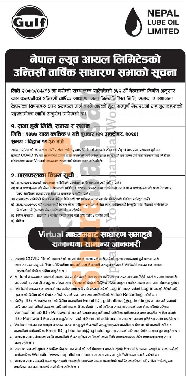 Nepal Lube Oil Limited has announced its 29th AGM going to be held on 5th Kartik, 2077.
