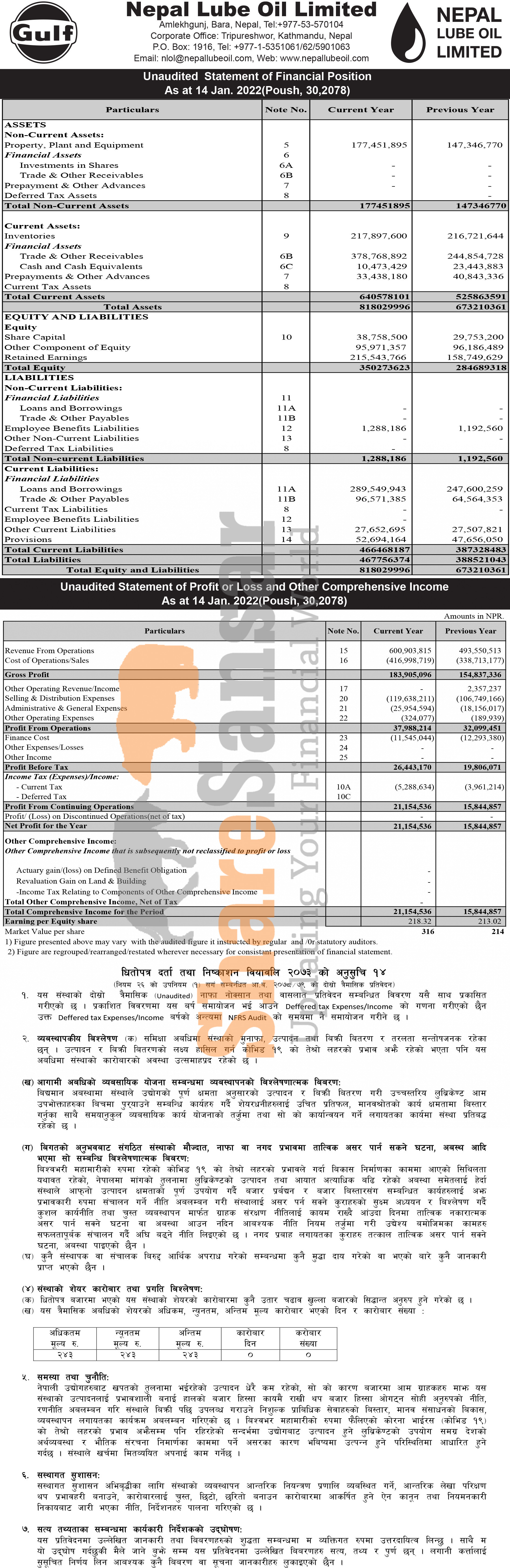 Nepal Lube Oil Limited has posted a net profit of Rs 21.15 million and published its 2nd quarter company analysis of the fiscal year 2078/79.