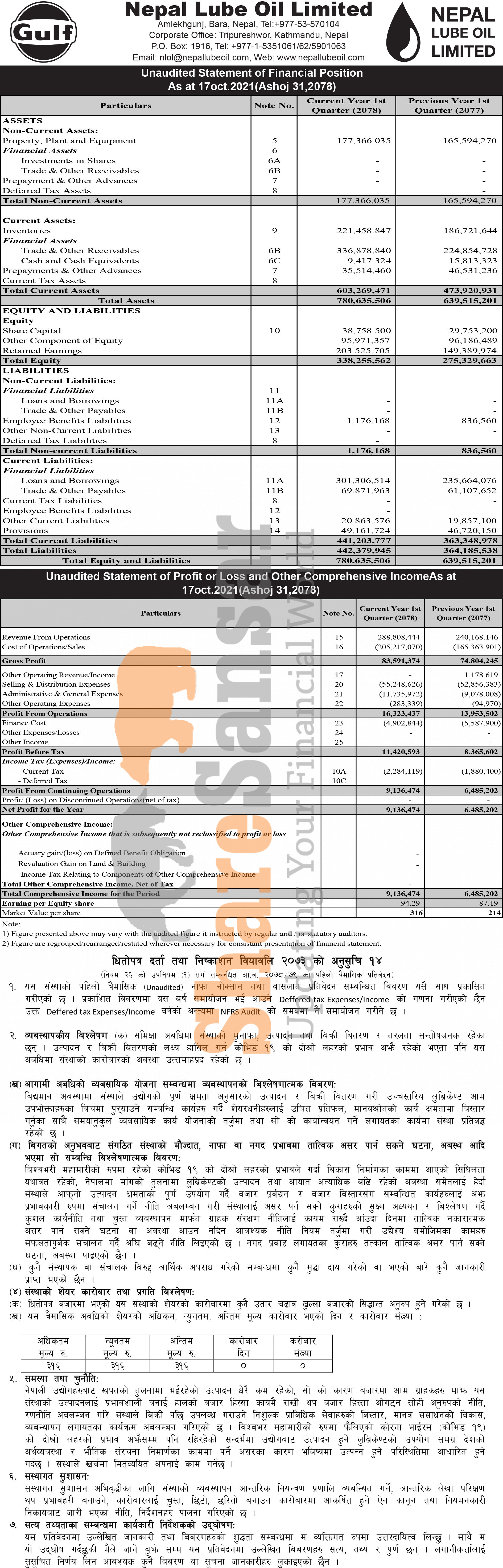 Nepal Lube Oil Limited has posted a net profit of Rs 9.13 million and published its 1st quarter company analysis of the fiscal year 2078/79.