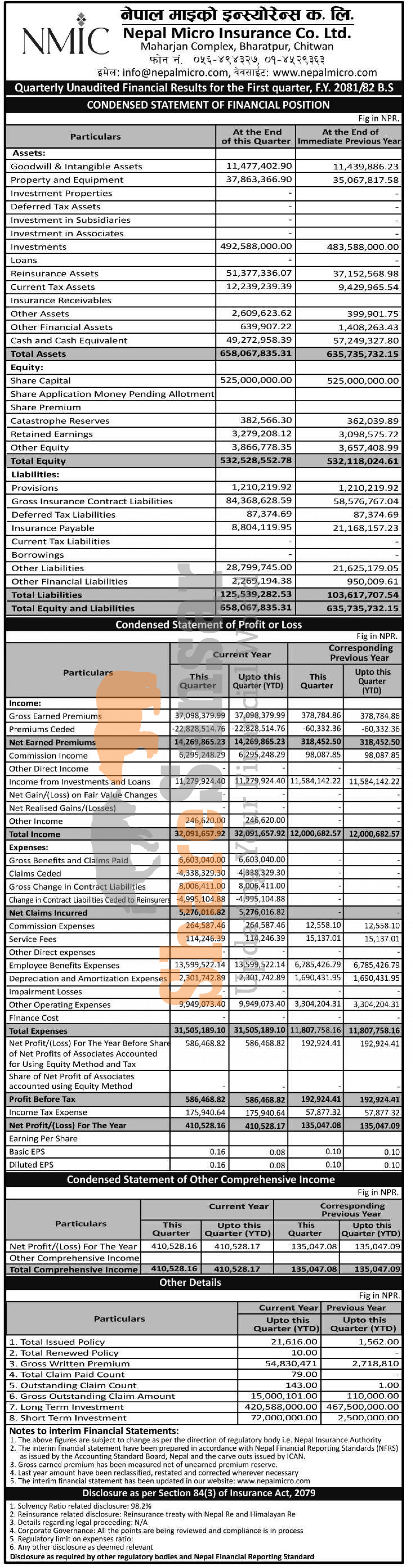 Nepal Micro Insurance Company Limited has posted a net profit of Rs 0.41 million and published its 1st quarter company analysis of the fiscal year 2081/82.