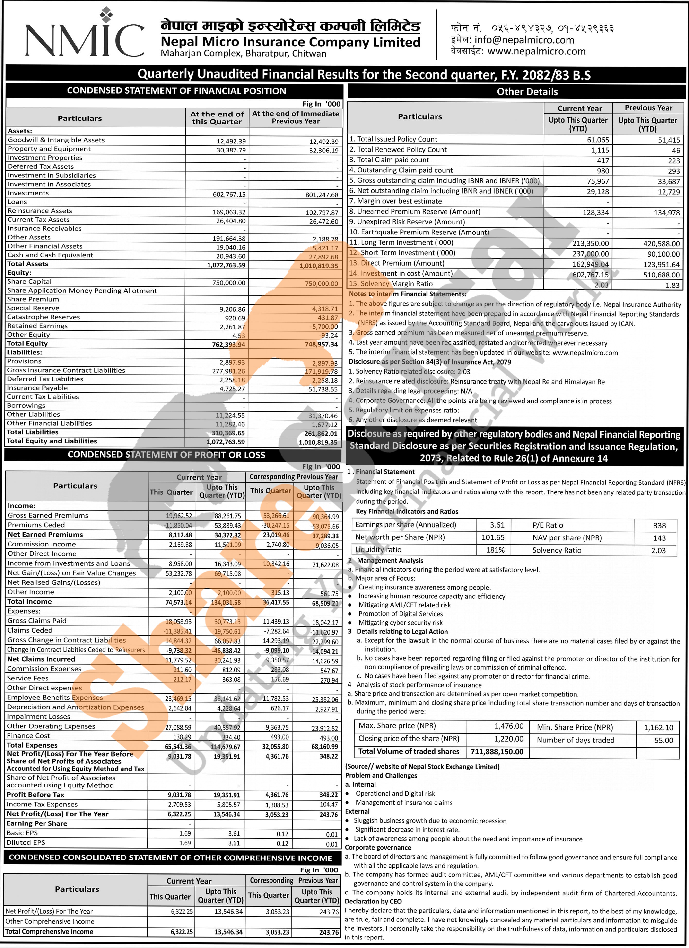 Nepal Micro Insurance Company Limited has posted a net profit of Rs 13.54 million and published its 2nd quarter company analysis of the fiscal year 2082/83.