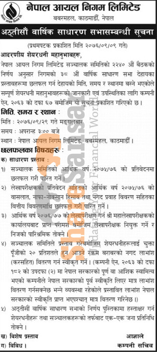 Nepal Oil Corporation Limited has announced its 38th AGM going to be held on 29th Poush, 2076.