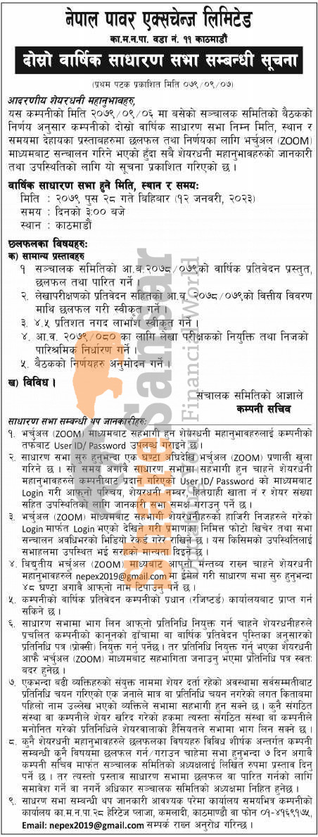Nepal Power Exchange Limited has announced its 2nd AGM going to be held on 28th Poush, 2079.