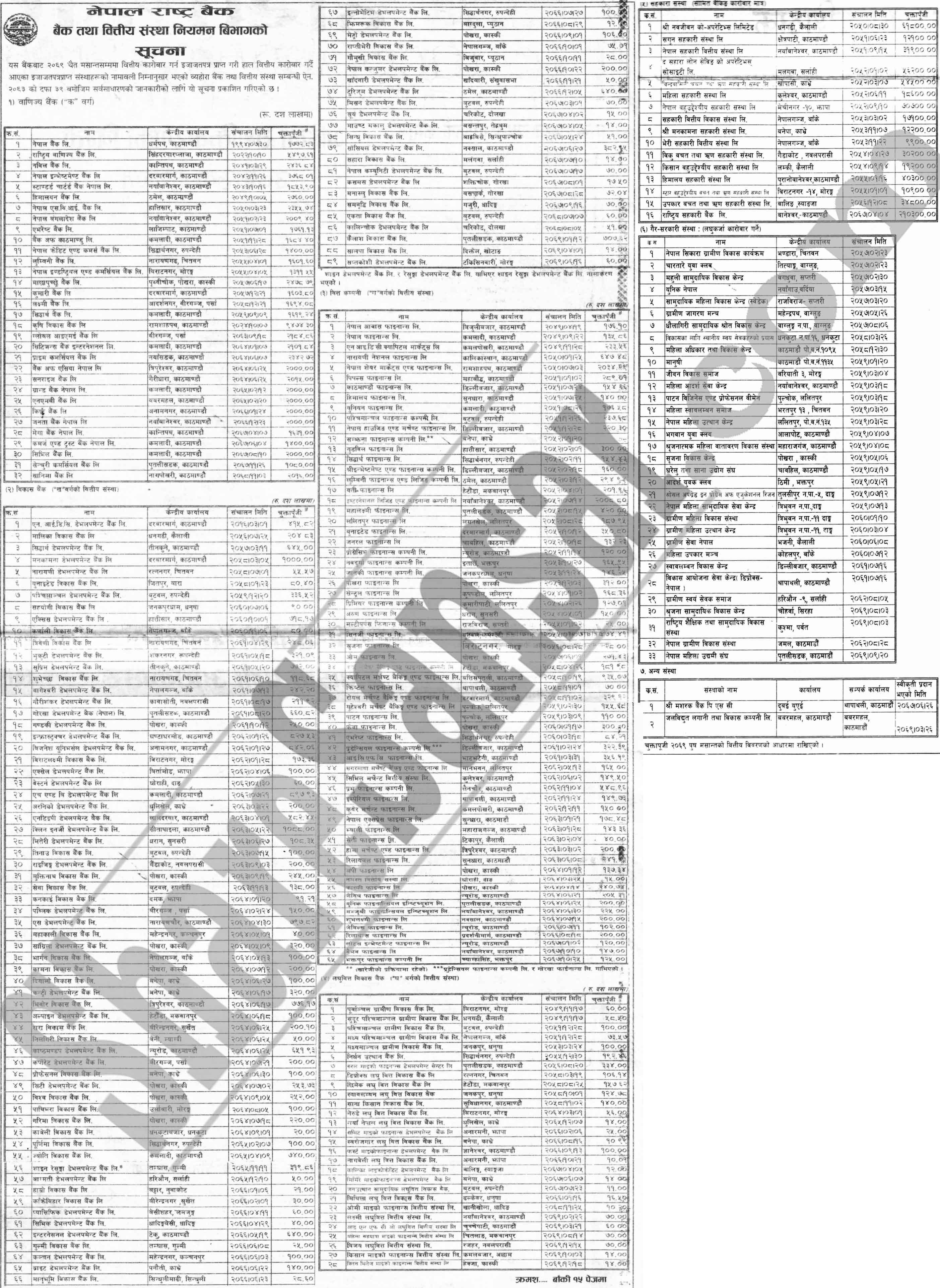 Nepal Rastra Bank has published a list of Banks and Financial Institutions with their corresponding paid up capital as of Chaitra end, 2069.