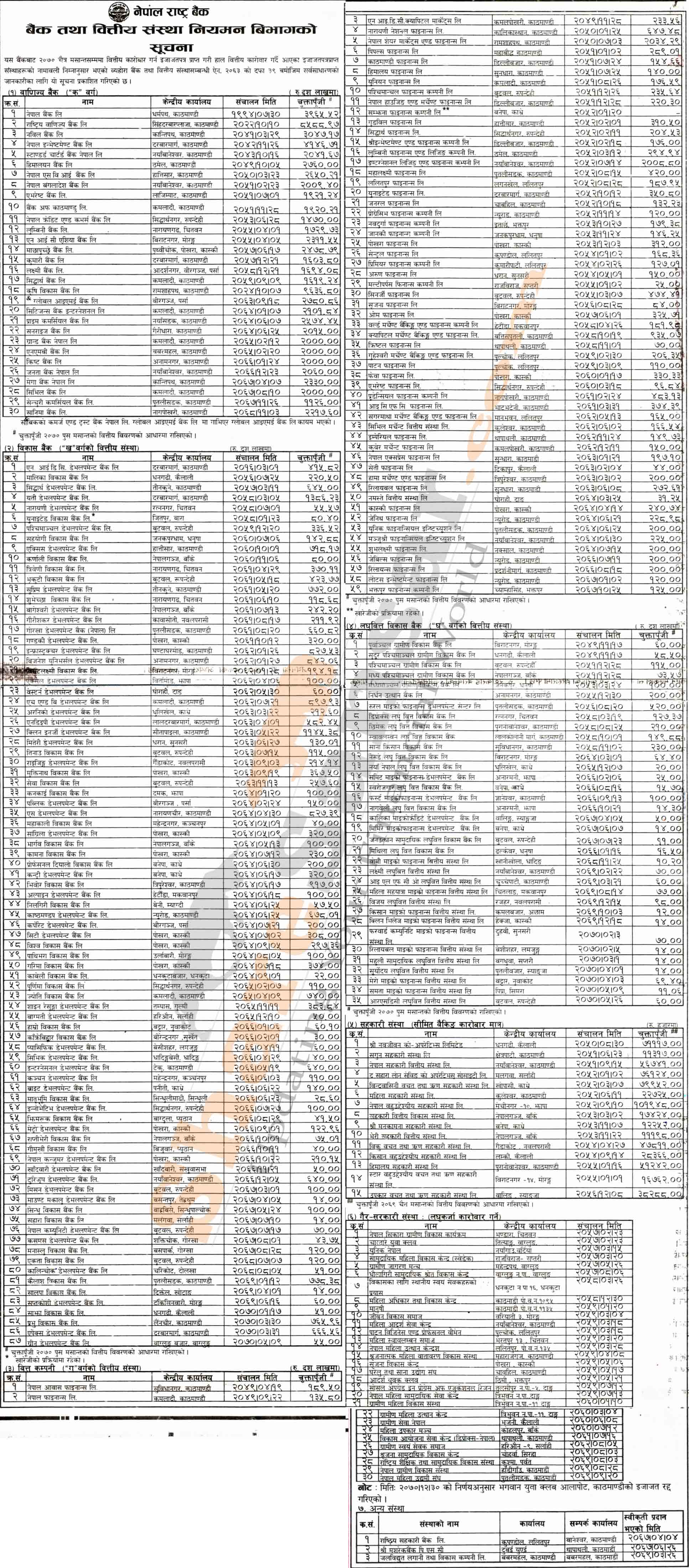 Nepal Rastra Bank has published a list of Banks and Financial Institutions with their corresponding paid up capital as of Chaitra end, 2070.