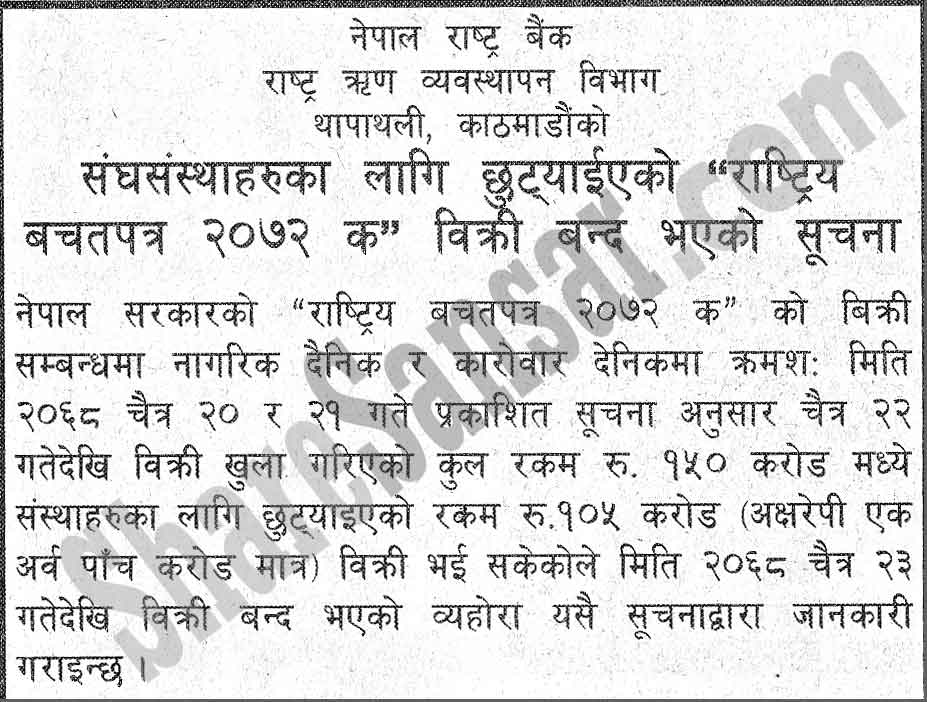 Nepal Rastra Bank has published a notice regarding closing of Rs 1050 million (National Saving Bond 2072 Ka) issue for institutions from today.