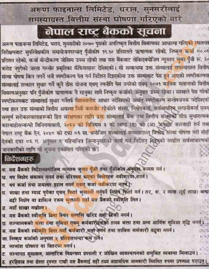 Nepal Rastra Bank has published a notice regarding declaring a crisis ridden of Arun Finance Limited.
