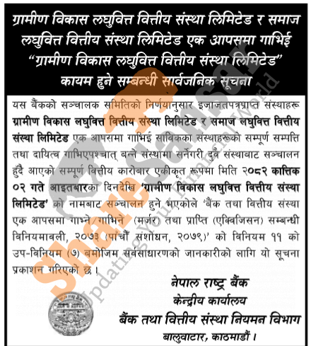 Nepal Rastra Bank has published a notice regarding the successful merger of Grameen Bikas Laghubitta Bittiya Sanstha Limited and Samaj Laghubitta Bittiya Sanstha Limited to commence its joint transactions in the name of "Grameen Bikas Laghubitta Bittiya Sanstha Limited" from 2nd Kartik, 2082.