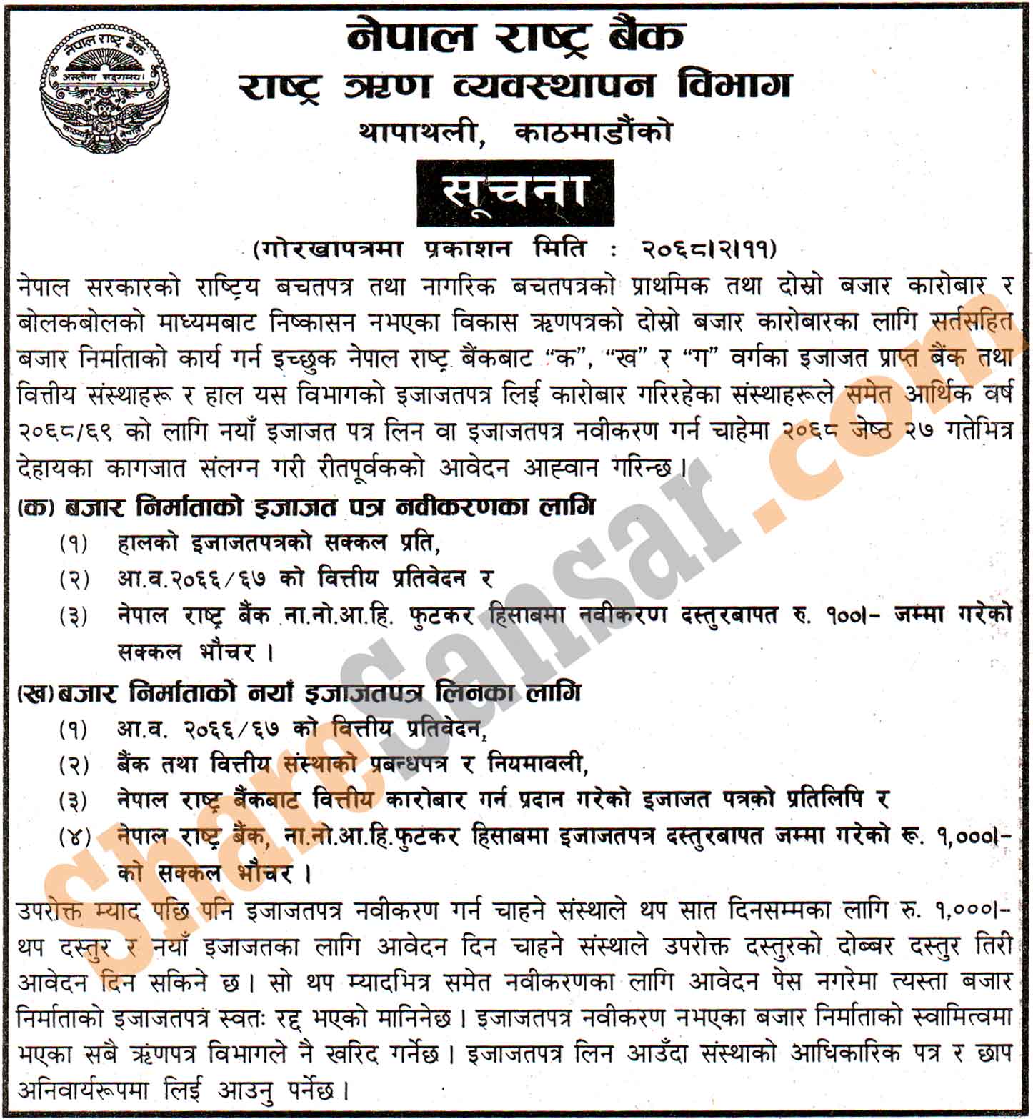 Nepal Rastra Bank has published a notice to BFIs regarding renewal of market maker license.