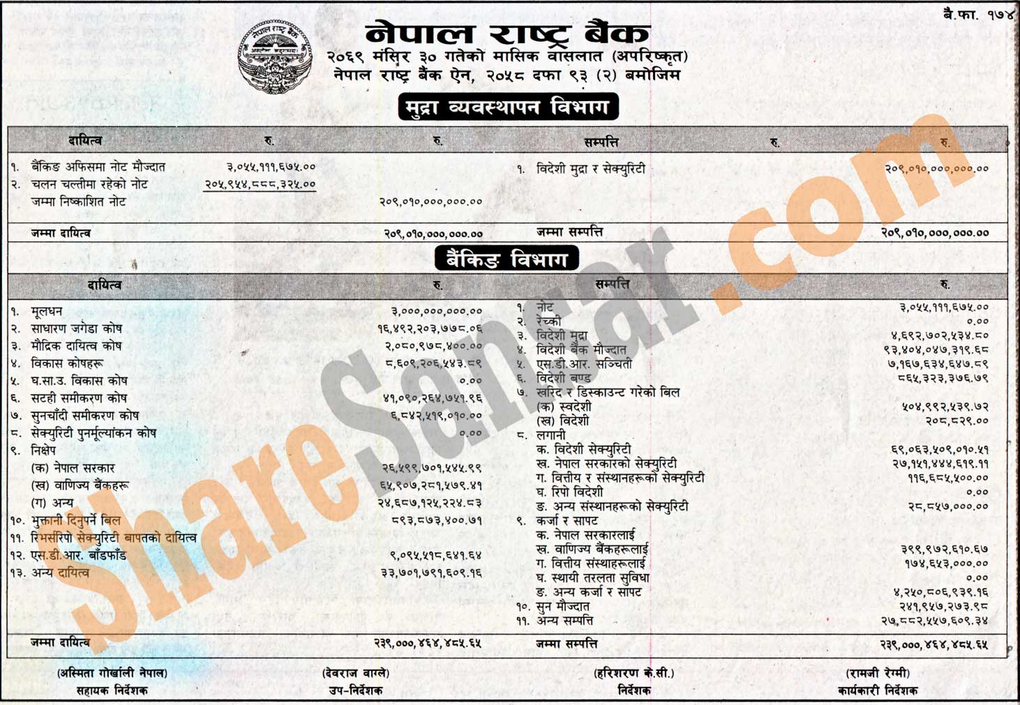 Nepal Rastra Bank has published its monthly balance sheet for the month of 30th Mangsir, 2069.