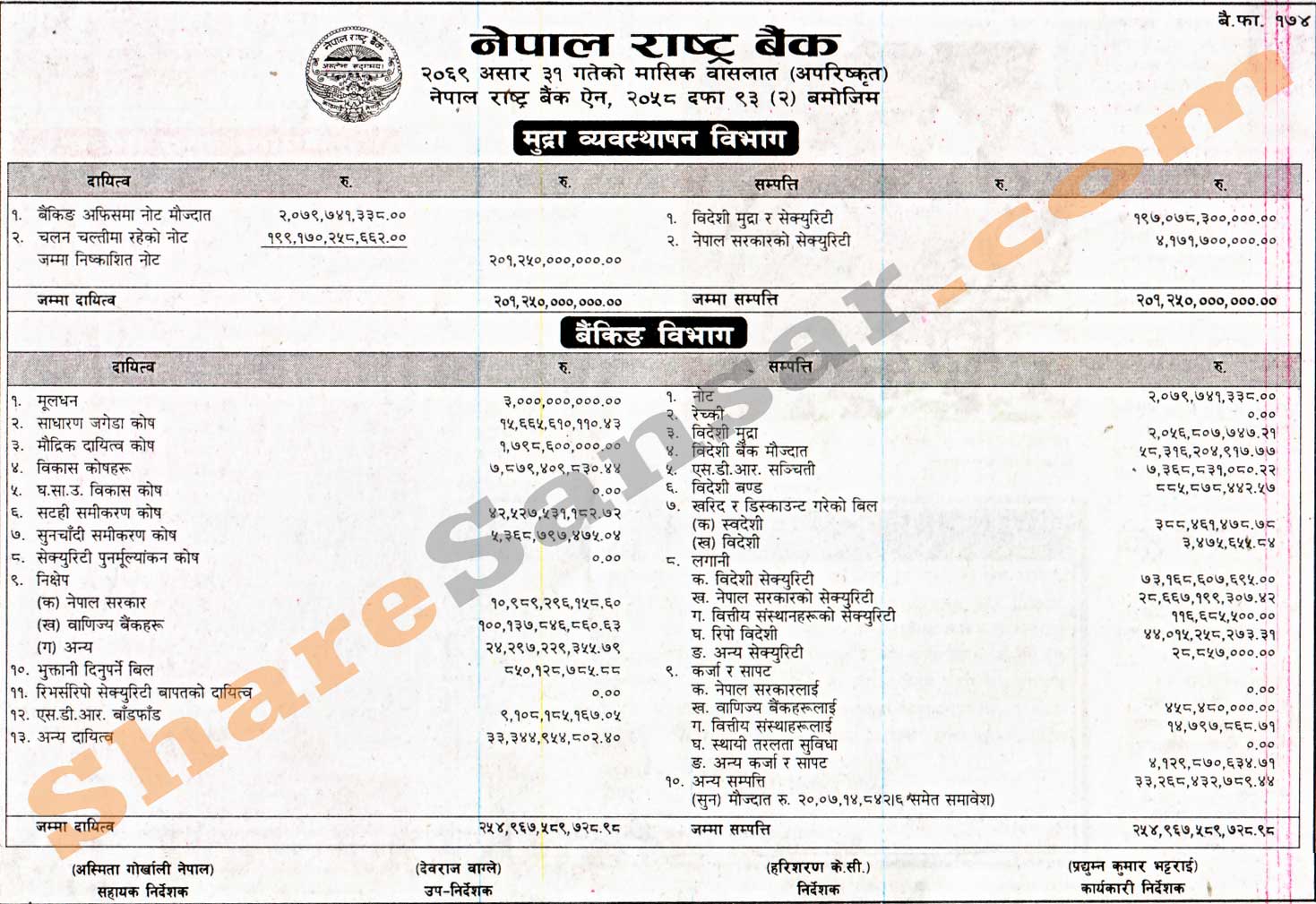 Nepal Rastra Bank has published its monthly balance sheet for the month of Asar, 2069.