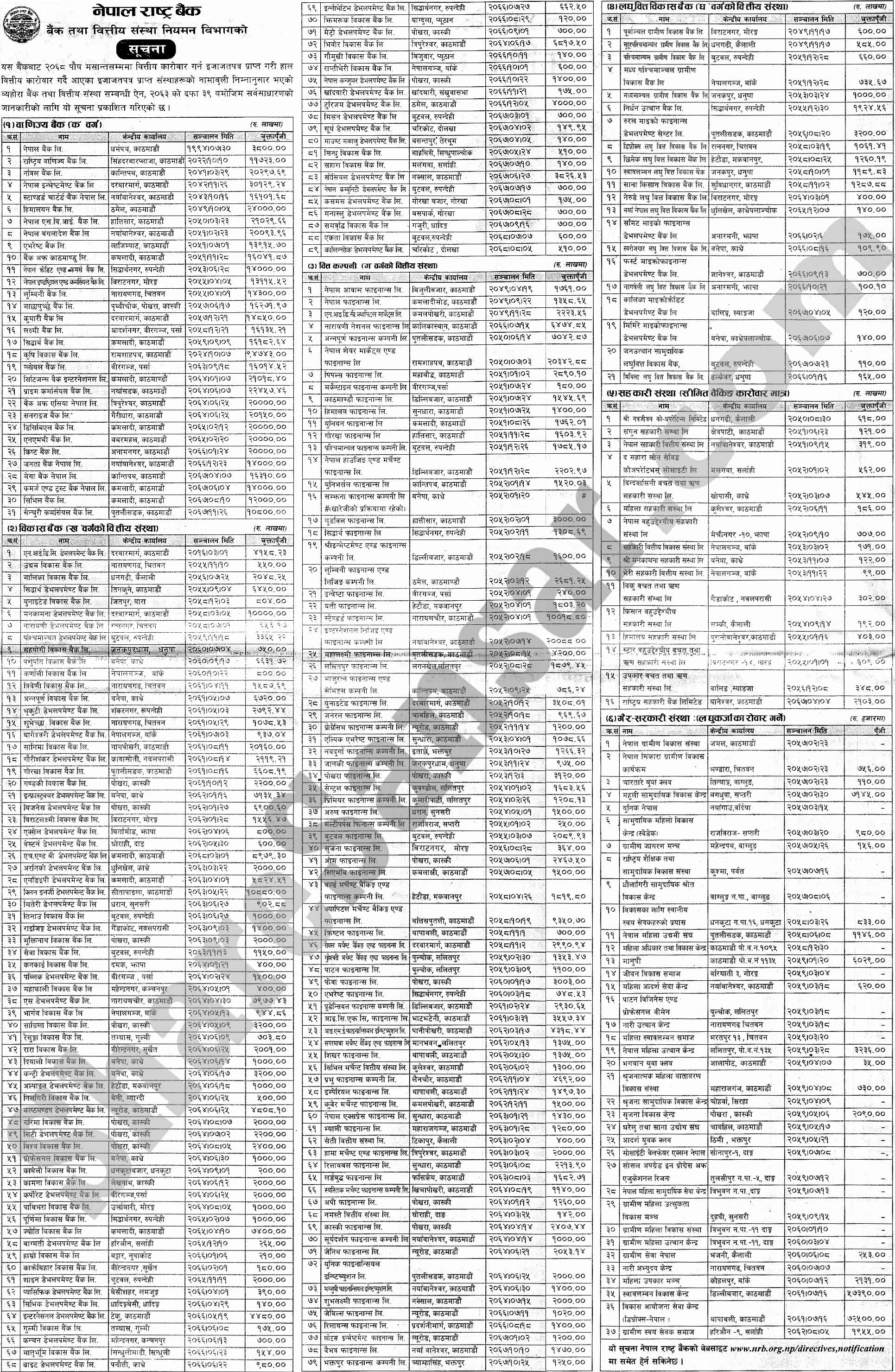 Nepal Rastra Bank has published list of banks and financial institutions as of 30th Posh, 2068.
