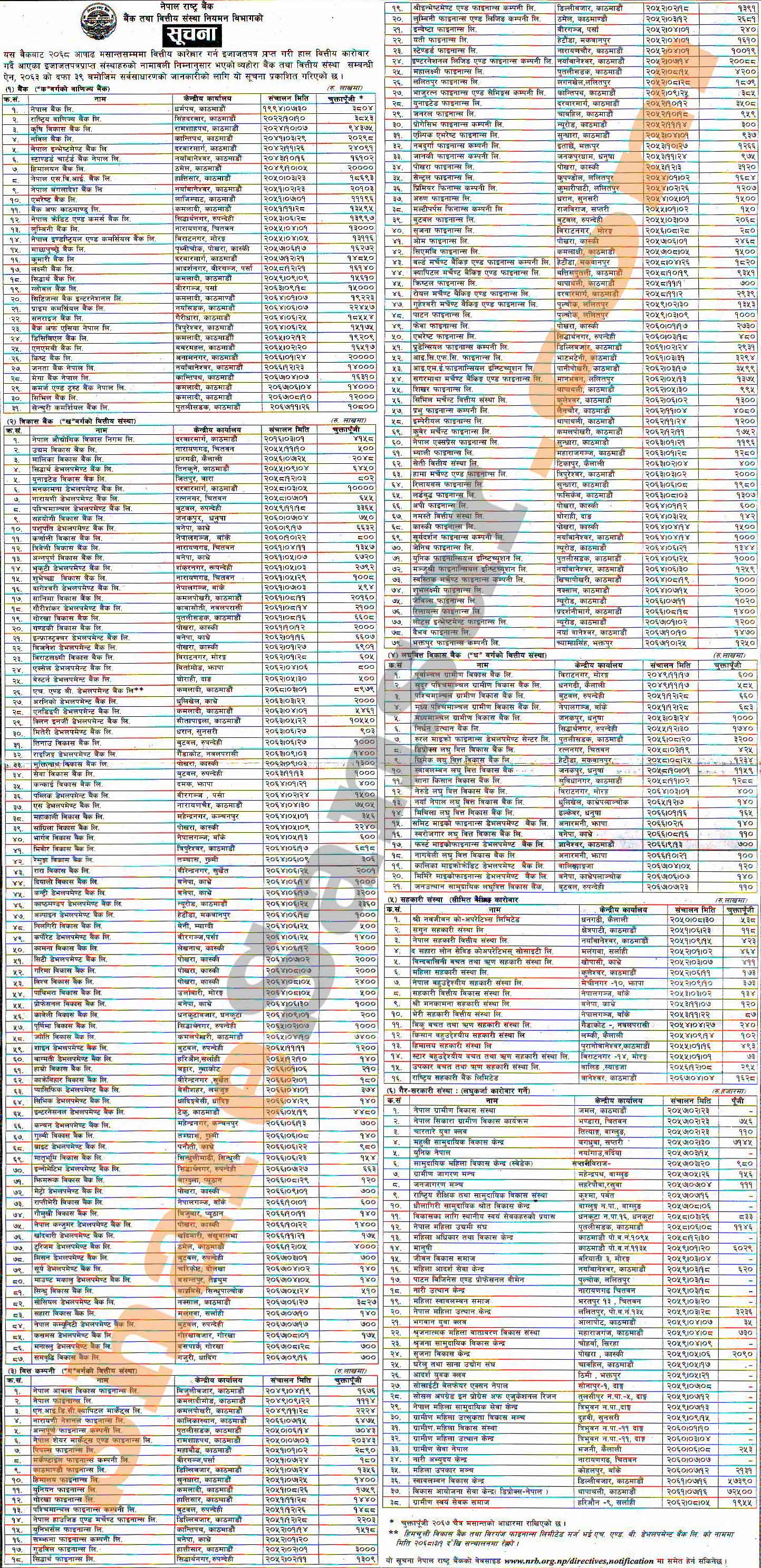 Nepal Rastra Bank has published list of banks and financial institutions as of 32nd Asad, 2068.