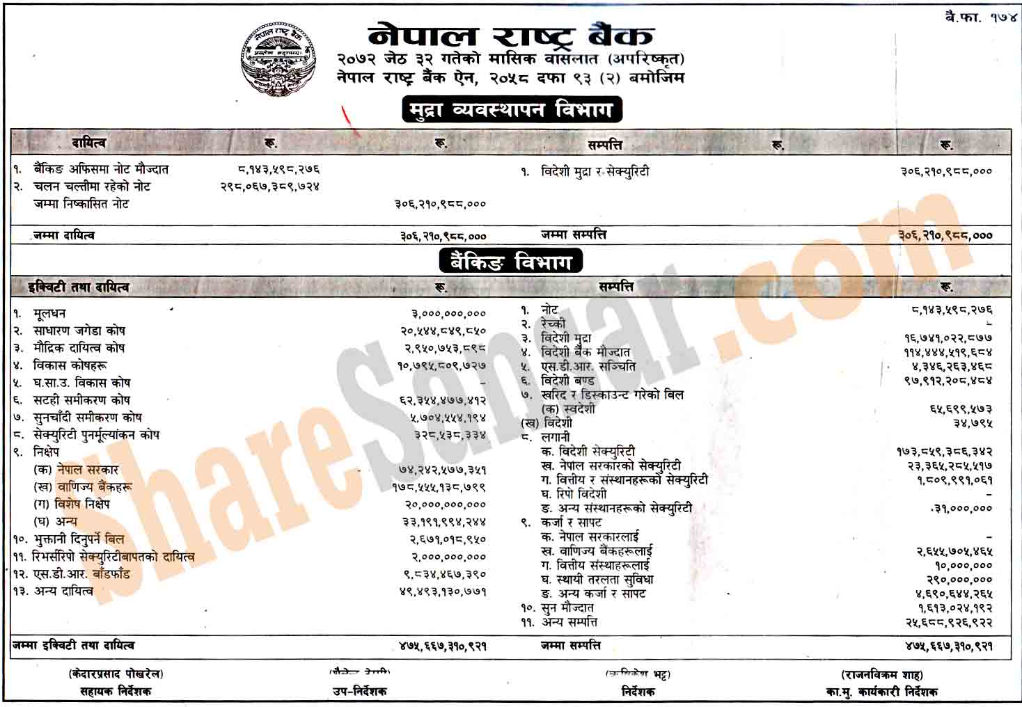 Nepal Rastra Bank has published the monthly balance sheet for the month of 32nd Jestha, 2072.