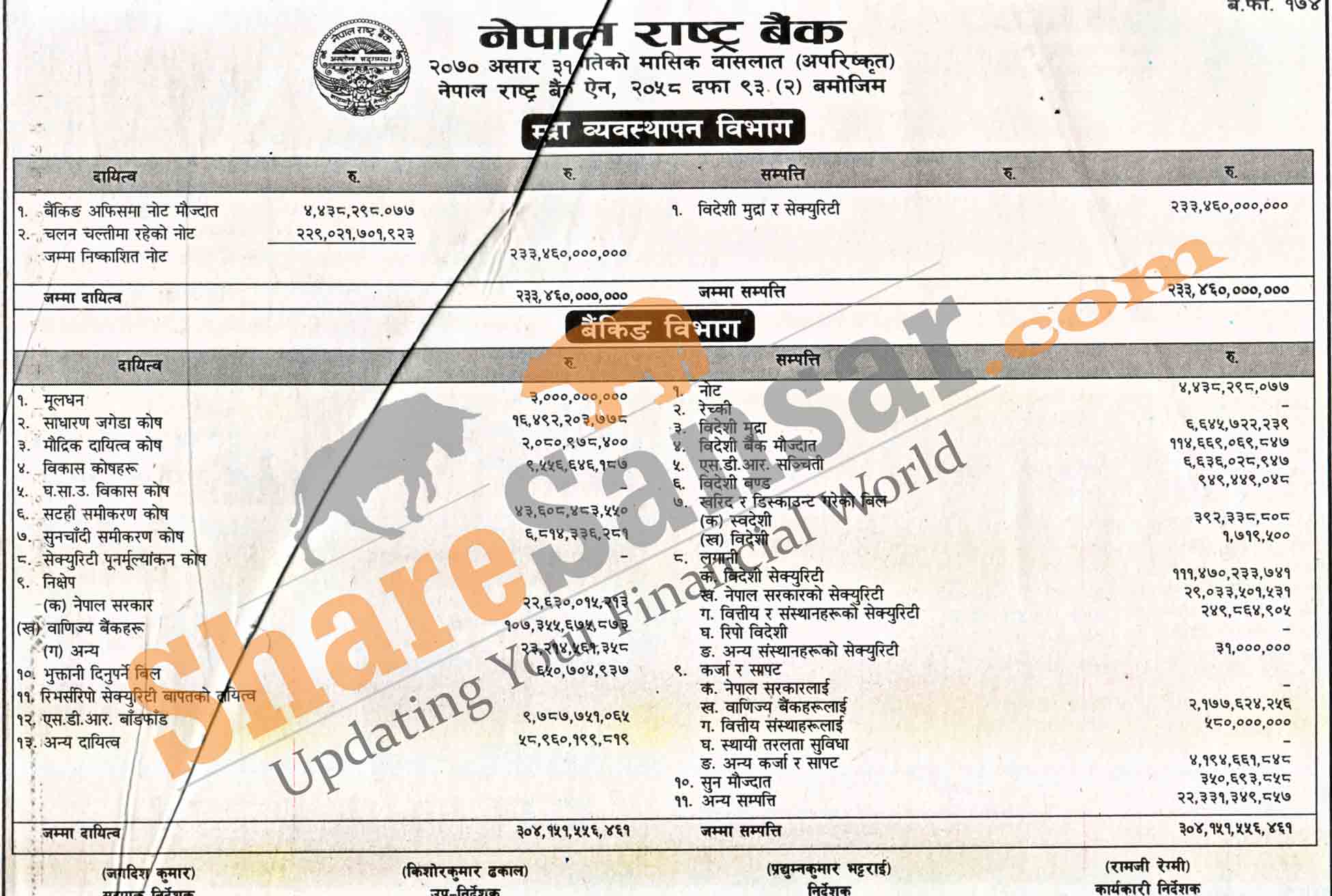 Nepal Rastra Bank has published the monthly balance sheet for the month of Ashad, 2070.