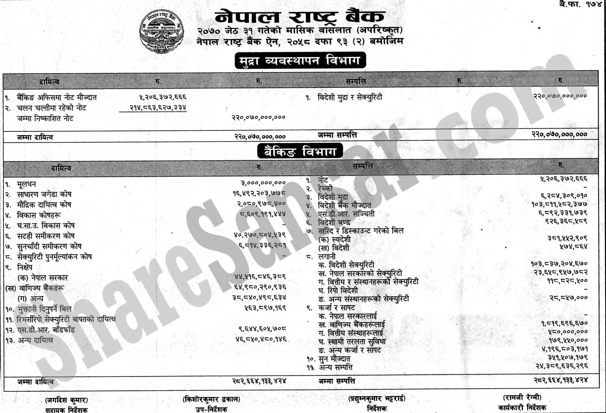 Nepal Rastra Bank has published the monthly balance sheet for the month of Jestha, 2070.