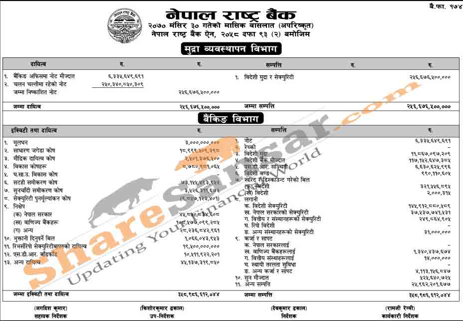 Nepal Rastra Bank has published the monthly balance sheet for the month of mangsir, 2070.
