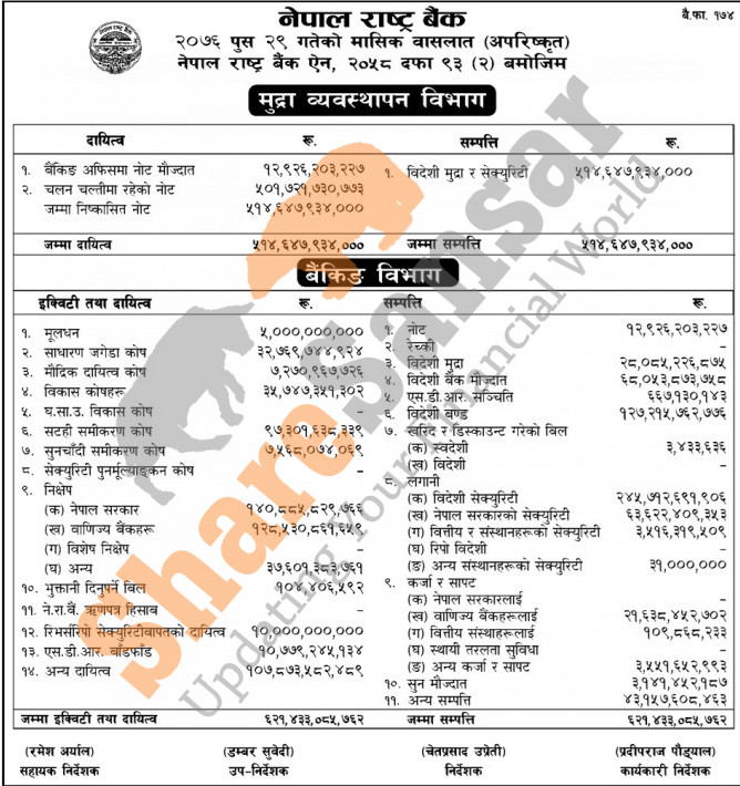 Nepal Rastra Bank has published the monthly balance sheet for the month of Poush, 2076.