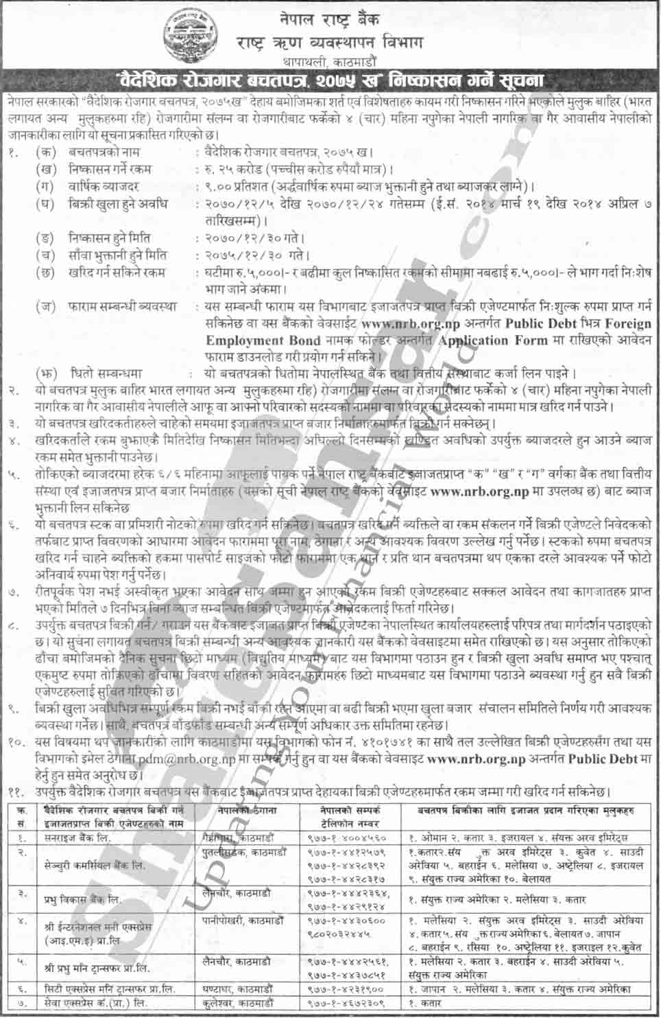 Nepal Rastra Bank is issuing Rs.250 million (Foreign Employment Bond, 2075 Kha) for 5 years period at 9% yearly interest for the Nepalese people working abroad and for the NRN from (5th to 24th Chaitra, 2070).