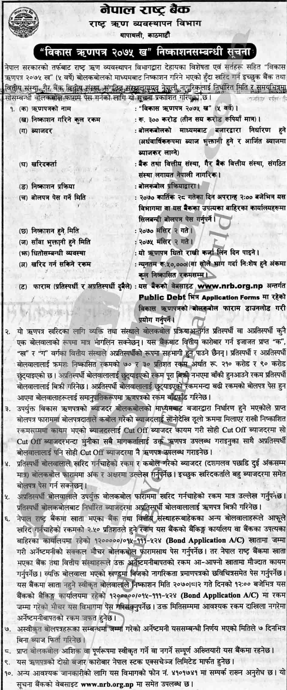 Nepal Rastra Bank is issuing Rs. 3000 million (Development Bond 2075 Kha) in auction to general public from (25th to 28th Kartik, 2070).