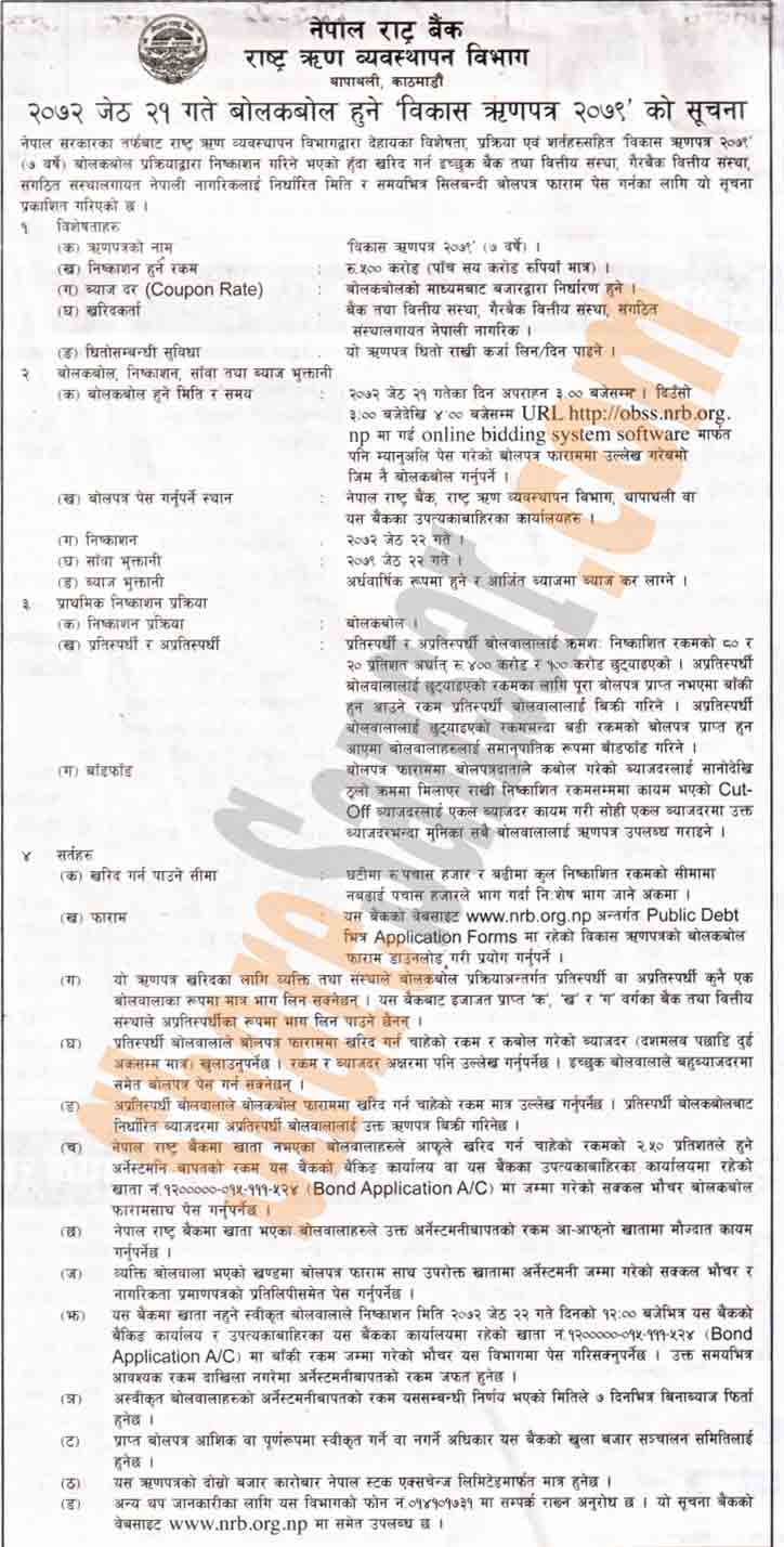 Nepal Rastra Bank is issuing Rs. 5000 million (Development Bond 2079) to the individual and institutional investors on 21st Jestha, 2072.