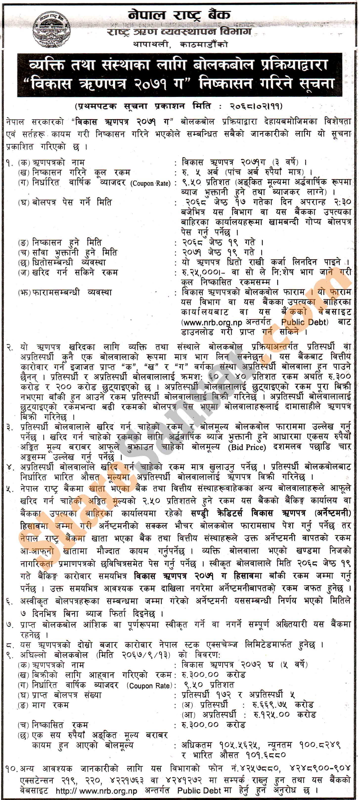 Nepal Rastra Bank (NRB) is issuing "Development Bond 2061" worth Rs. 5 billions.