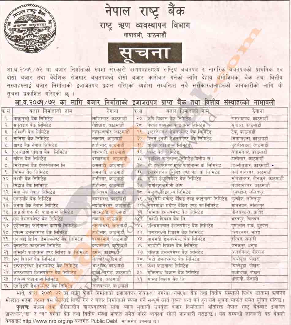 Nepal Rastriya Bank has published a list of financial institution to manage the govenment bond of the fiscal year 2071/72.