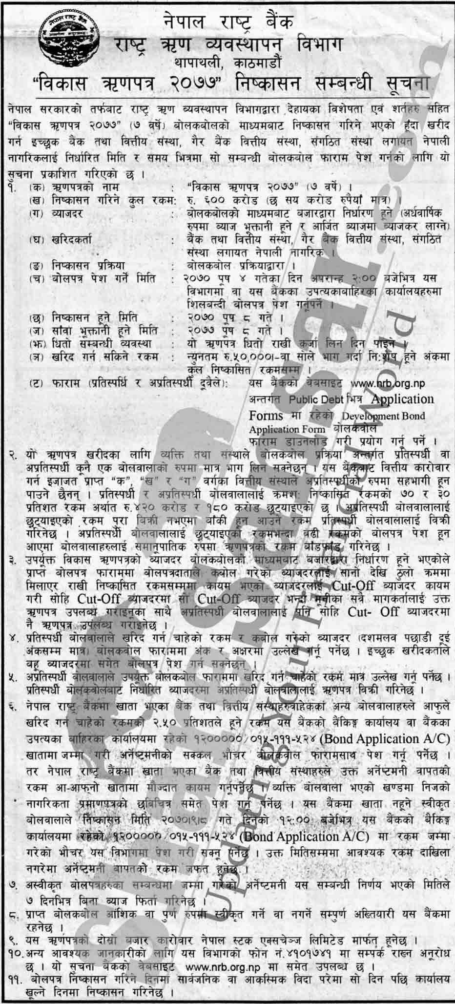 Nepal Rastriya Bank is issuing Rs 6,000 million (Development Bond 2077) in auction to the individual and institutional investors on 4th Poush, 2070.