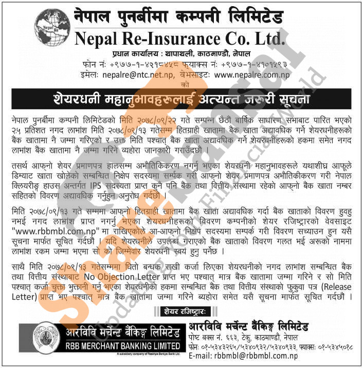 Nepal Re-Insurance Company Limited has distributed 2.5% cash dividend directly to bank accounts and urged its shareholders to dematerialize their shares.