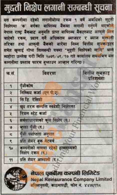 Nepal Reinsurance Company Limited has published a notice seeking quotation of Fixed Deposit interest.