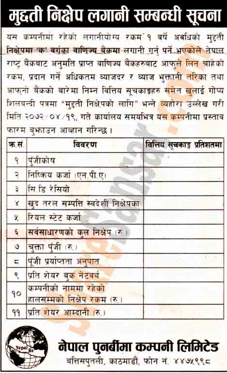 Nepal Reinsurance Company Limited has published a notice seeking quotation of Fixed Deposit interest.