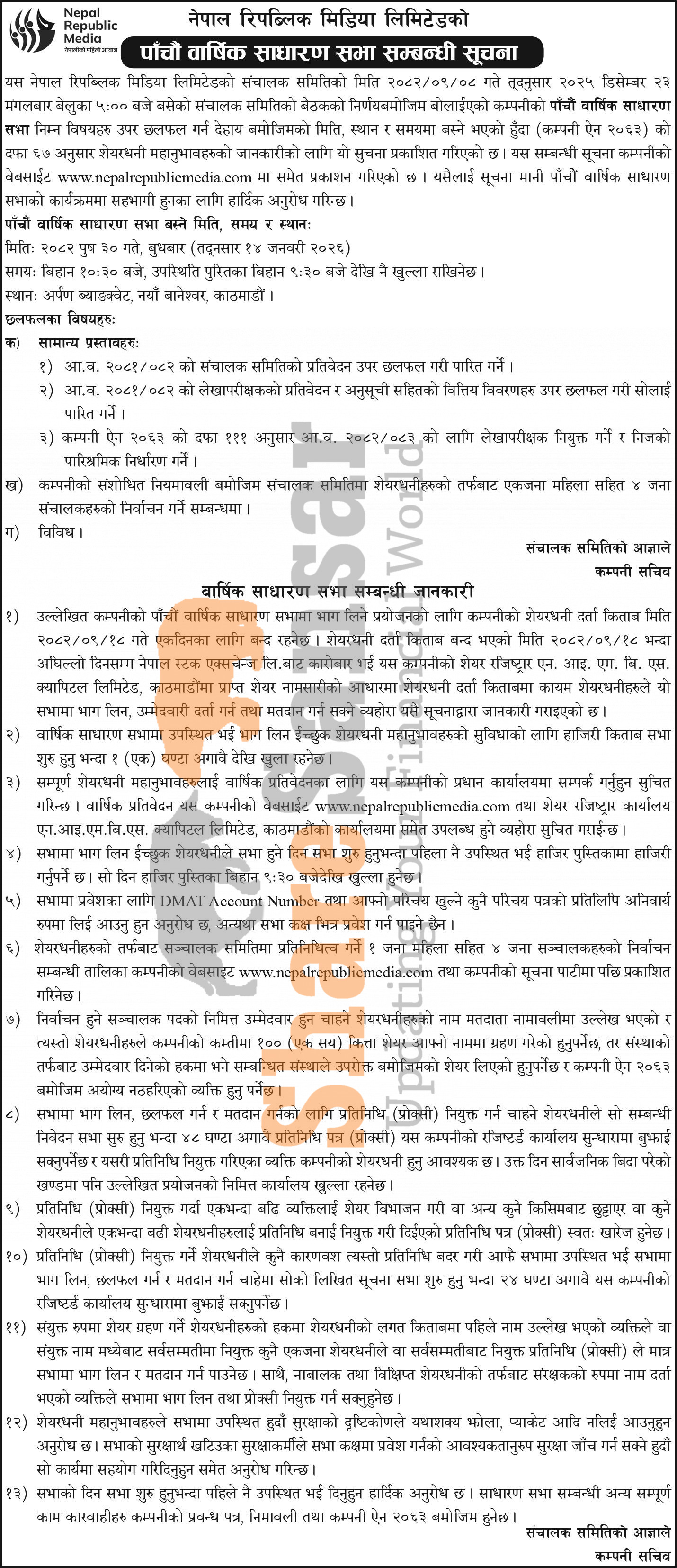 Nepal Republic Media Limited has announced its 5th AGM going to be held on 30th Poush, 2082.