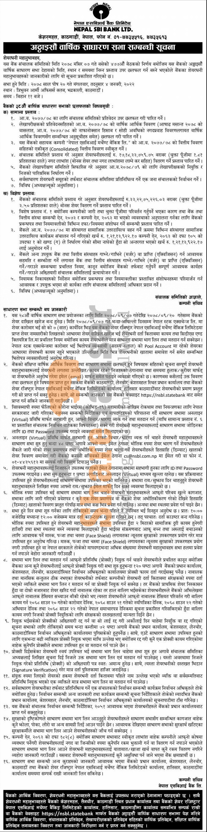 Nepal SBI Bank Limited has announced its 28th AGM going to be held on 20th Poush, 2078.