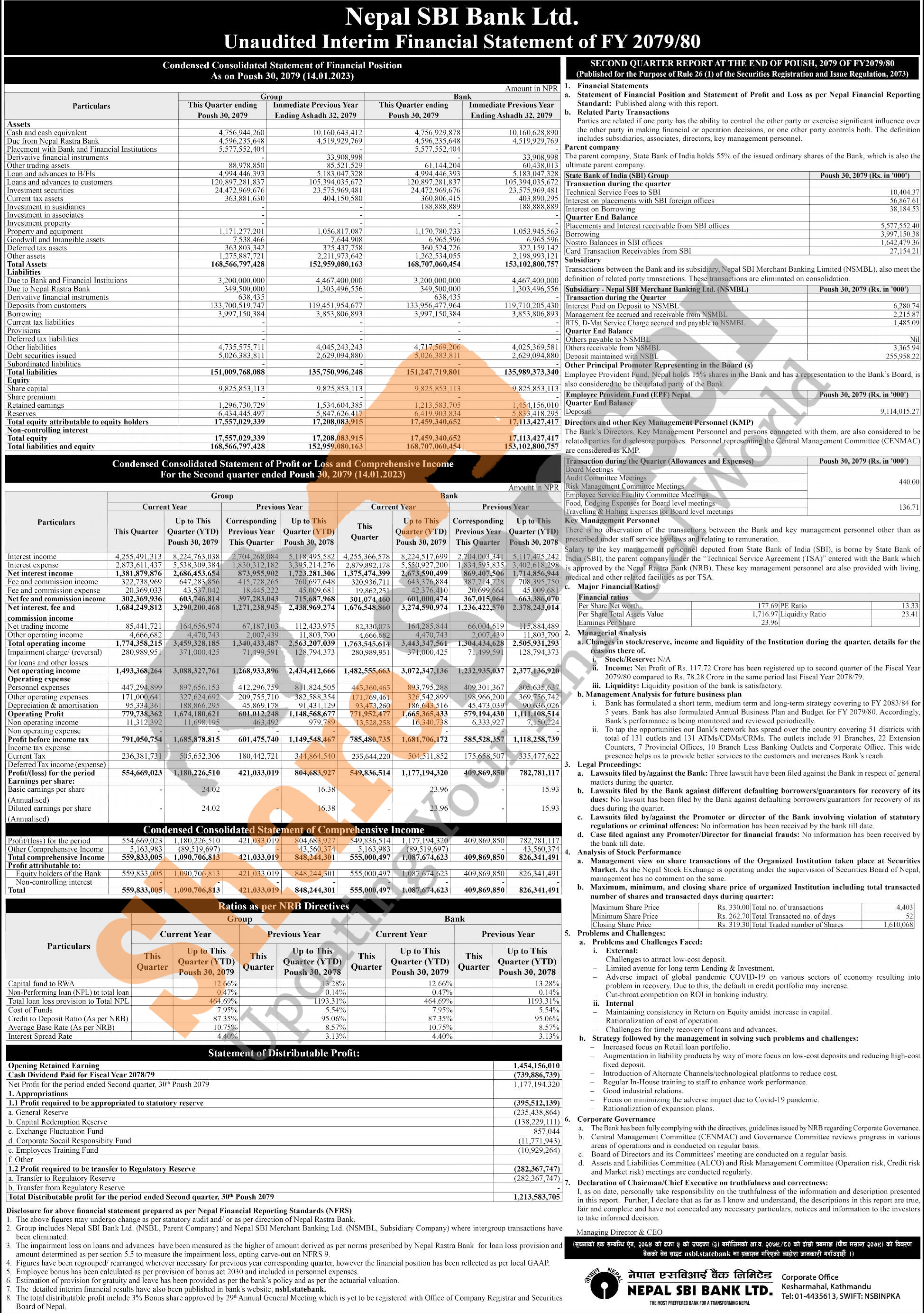 Nepal SBI Bank Limited has posted a net profit of Rs 1.17 billion and published its 2nd quarter company analysis of the fiscal year 2079/80.