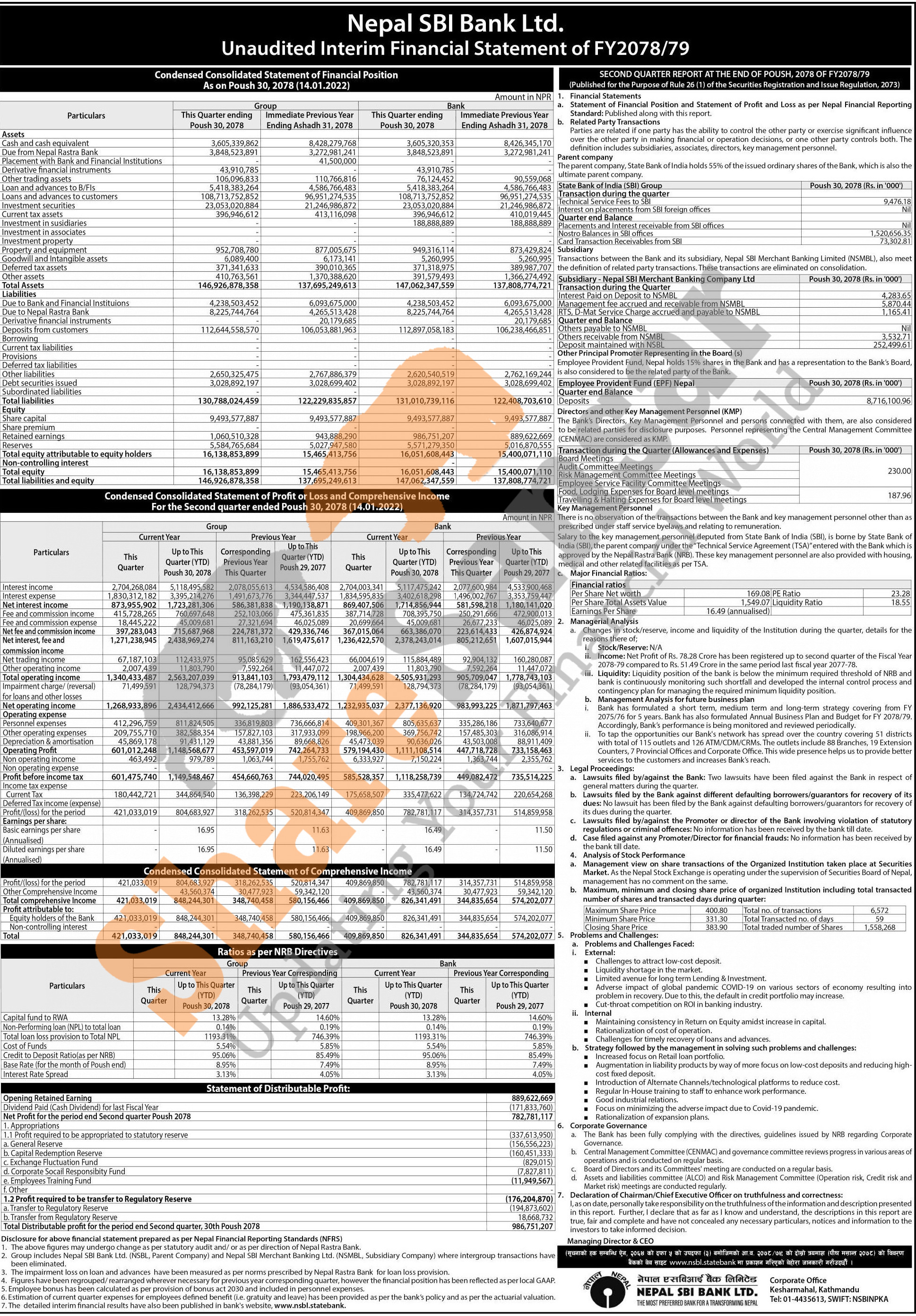 Nepal SBI Bank Limited has posted a net profit of Rs 782.78 million and published its 2nd quarter company analysis of the fiscal year 2078/79.